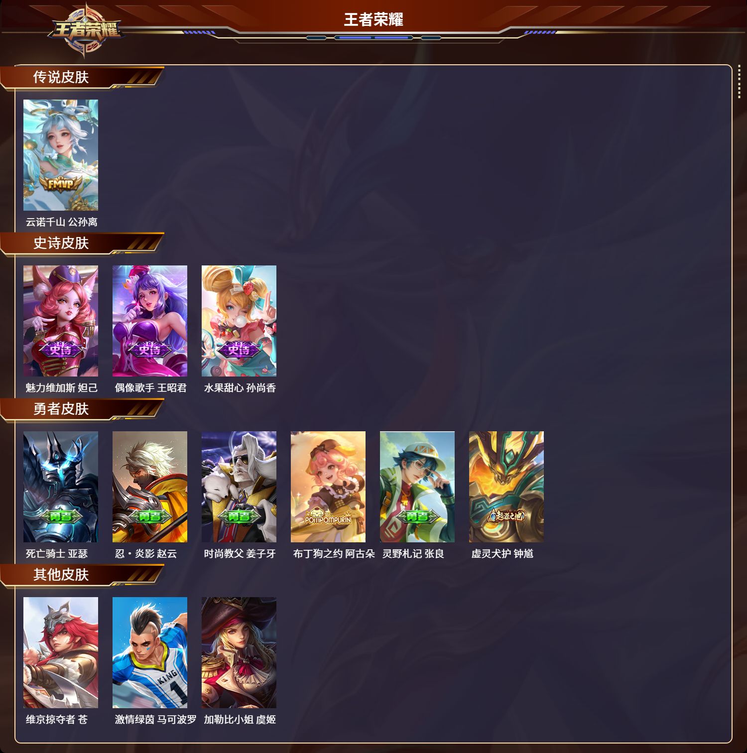 贵族等级:v6皮肤数:200情人节限定2 传说品质2 生肖限定3 英雄数:119