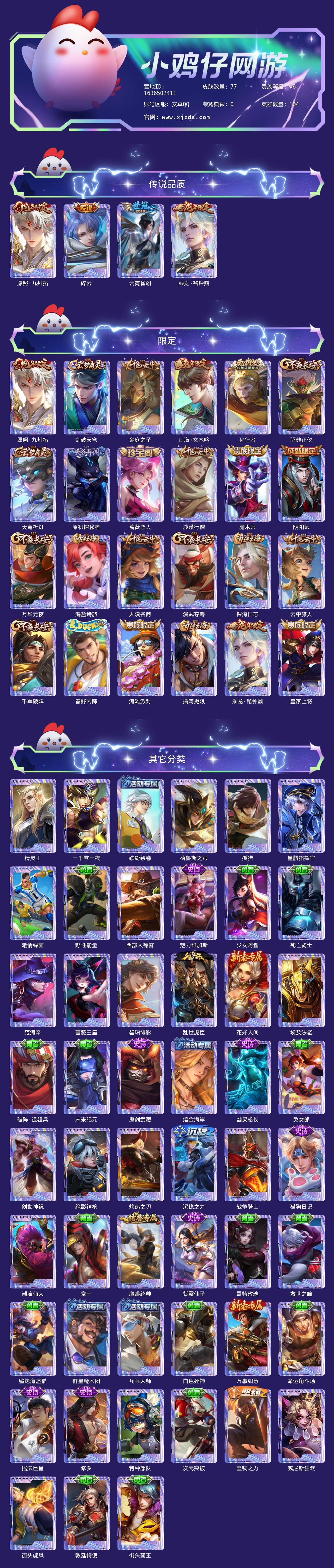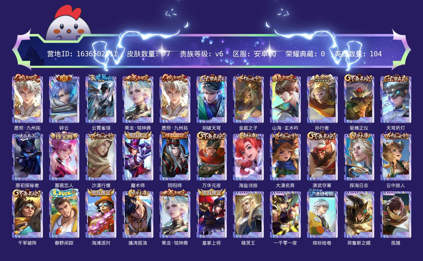 贵族等级:v6皮肤数:77传说品质4 生肖限定3 英雄数:104