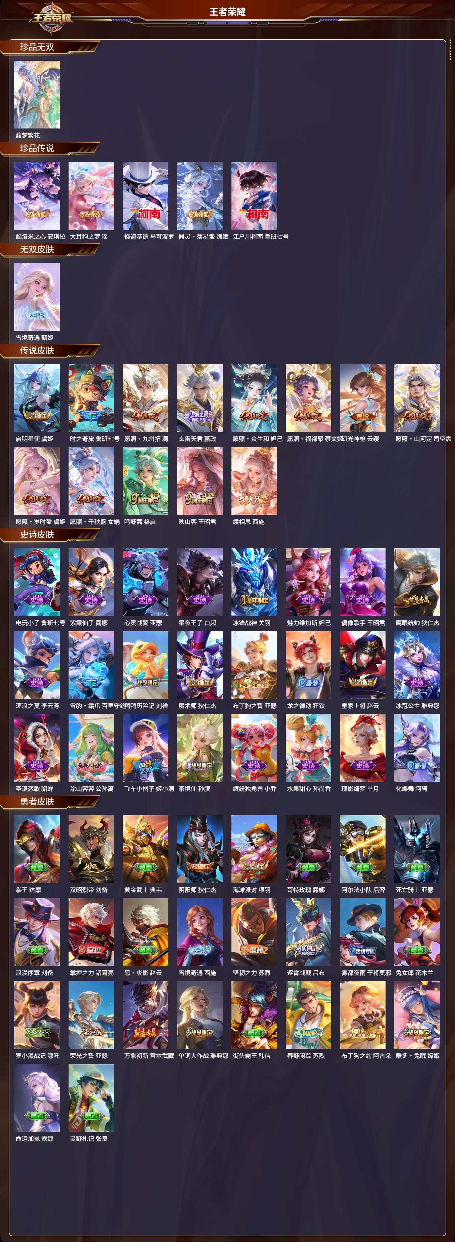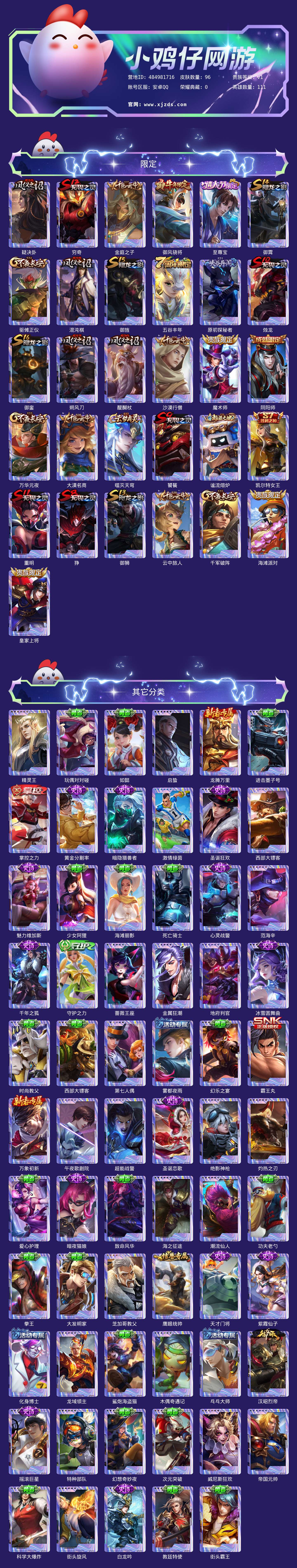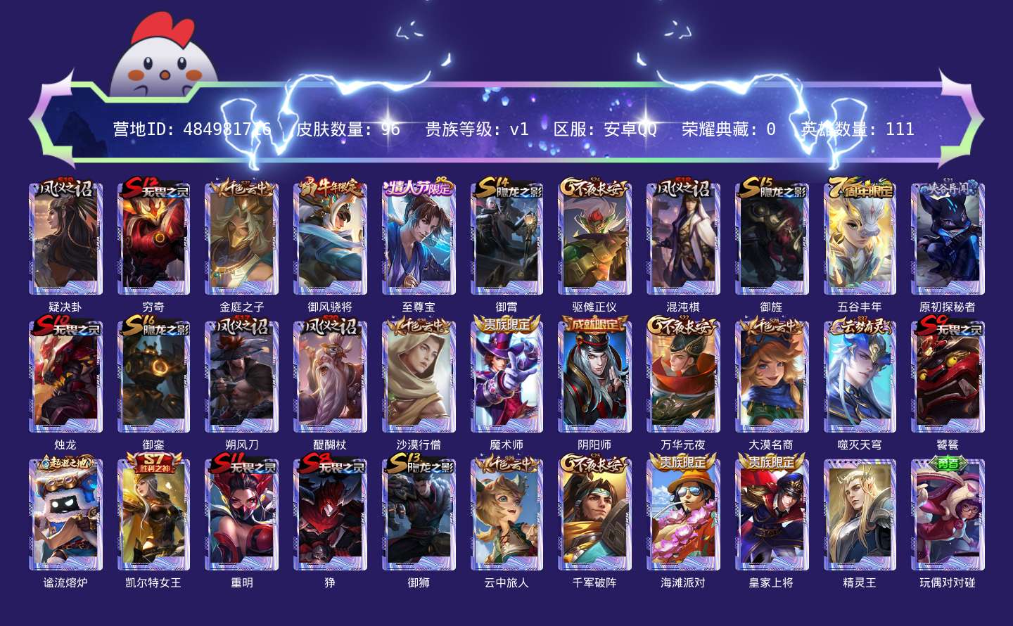 贵族等级:v1皮肤数:96生肖限定1 情人节限定1 英雄数:111