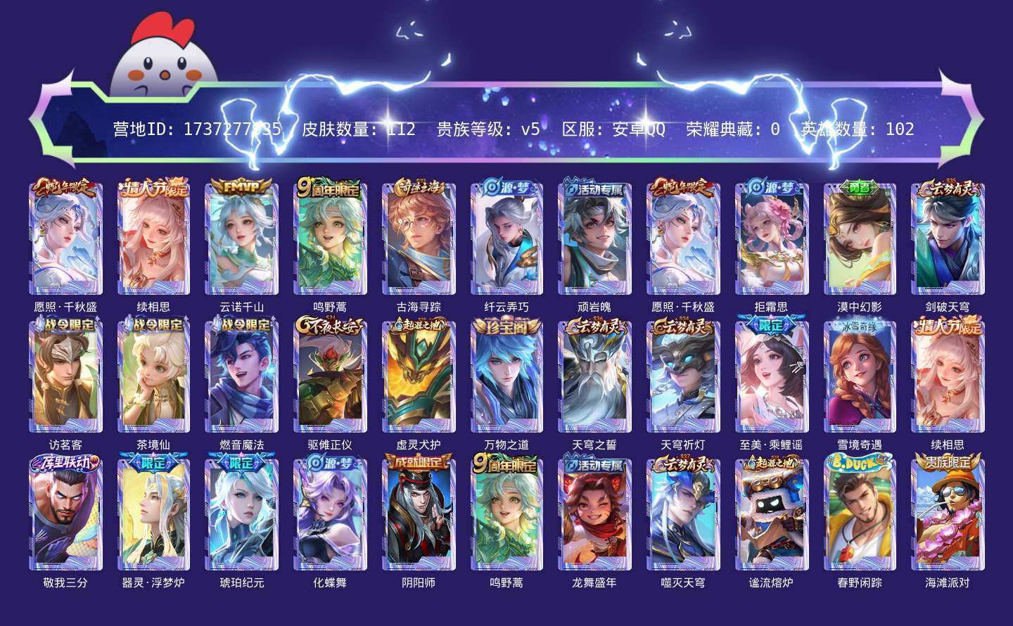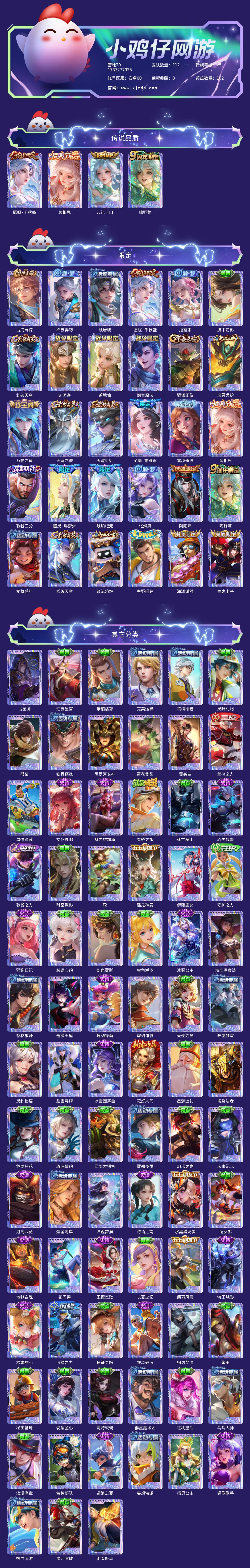 贵族等级:v5皮肤数:112传说品质4 生肖限定1 情人节限定1 英雄数:102