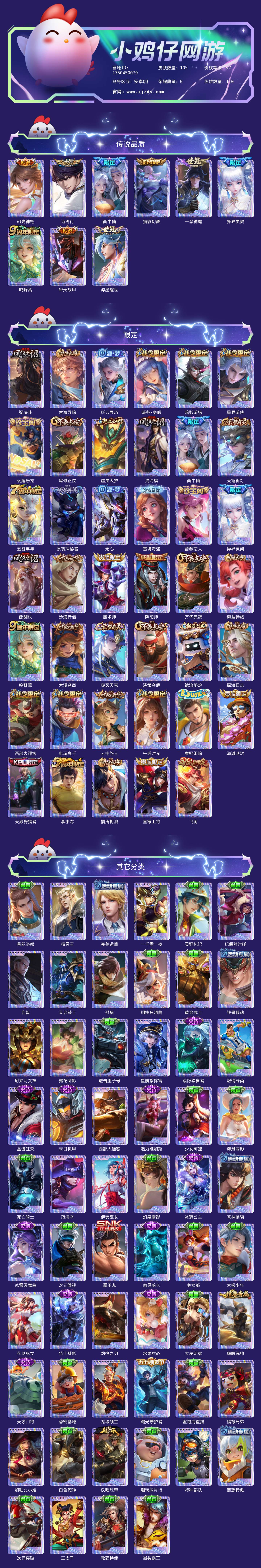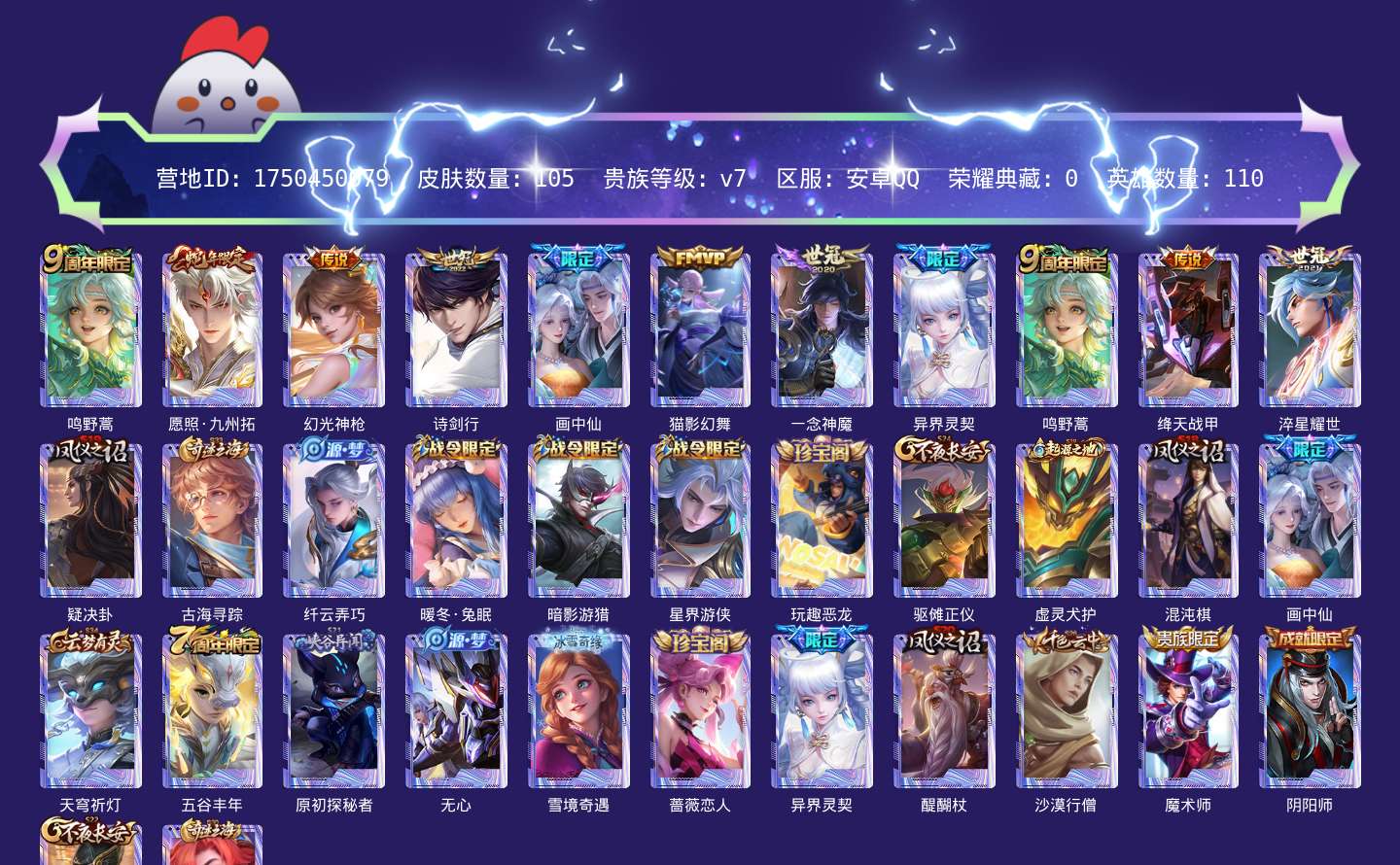 贵族等级:v7皮肤数:105传说品质9 生肖限定1 英雄数:110